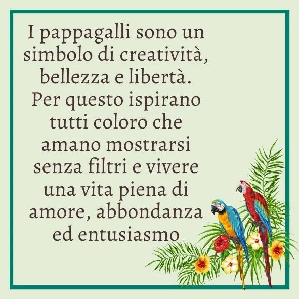 Il pappagallo, icona di creatività e spirito libero, rappresenta bellezza, espressione autentica e gioia di vivere. Indossarlo significa scegliere di mostrarsi senza filtri, con leggerezza e personalità.
