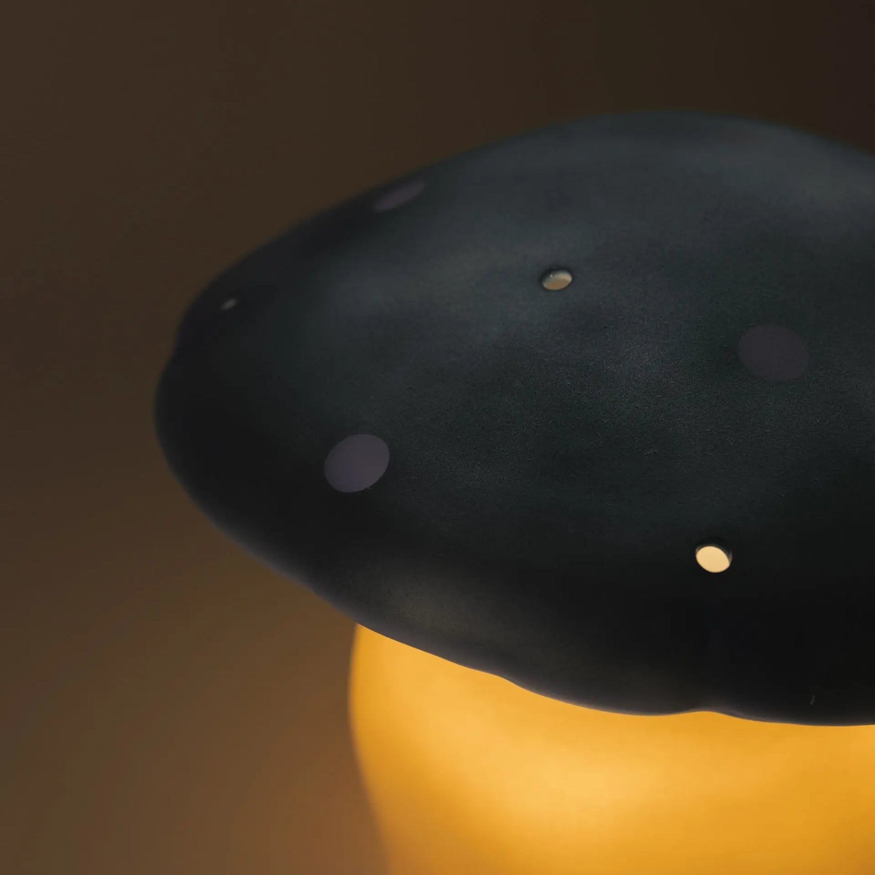 Con il suo cappello blu profondo punteggiato di pois bianchi e la finitura in porcellana opaca dipinta a mano, diffonde una luce calda e avvolgente che crea un’atmosfera rilassante e magica.