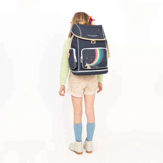 Il motivo Unicorn Gold, con dettagli dorati scintillanti e unicorni da sogno, rende questo zaino un vero colpo di fulmine per chi ama la magia e i dettagli curati.