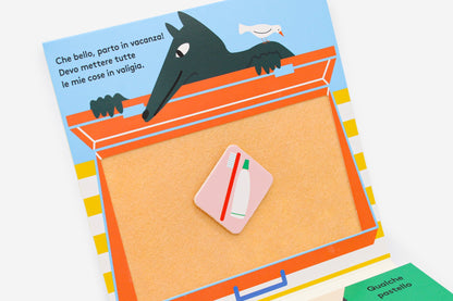 Pronti a partire con il Lupo? Il libro “Una vacanza da lupo” di L’Ippocampo è perfetto per coinvolgere i bambini dai 2 anni in una lettura interattiva e divertente. Aiuta il Lupo a preparare la valigia cercando e staccando i diversi oggetti nascosti nelle pagine: i pantaloncini sul filo del bucato, gli occhiali da sole nel cassetto, lo spazzolino in bagno… e molto altro!
