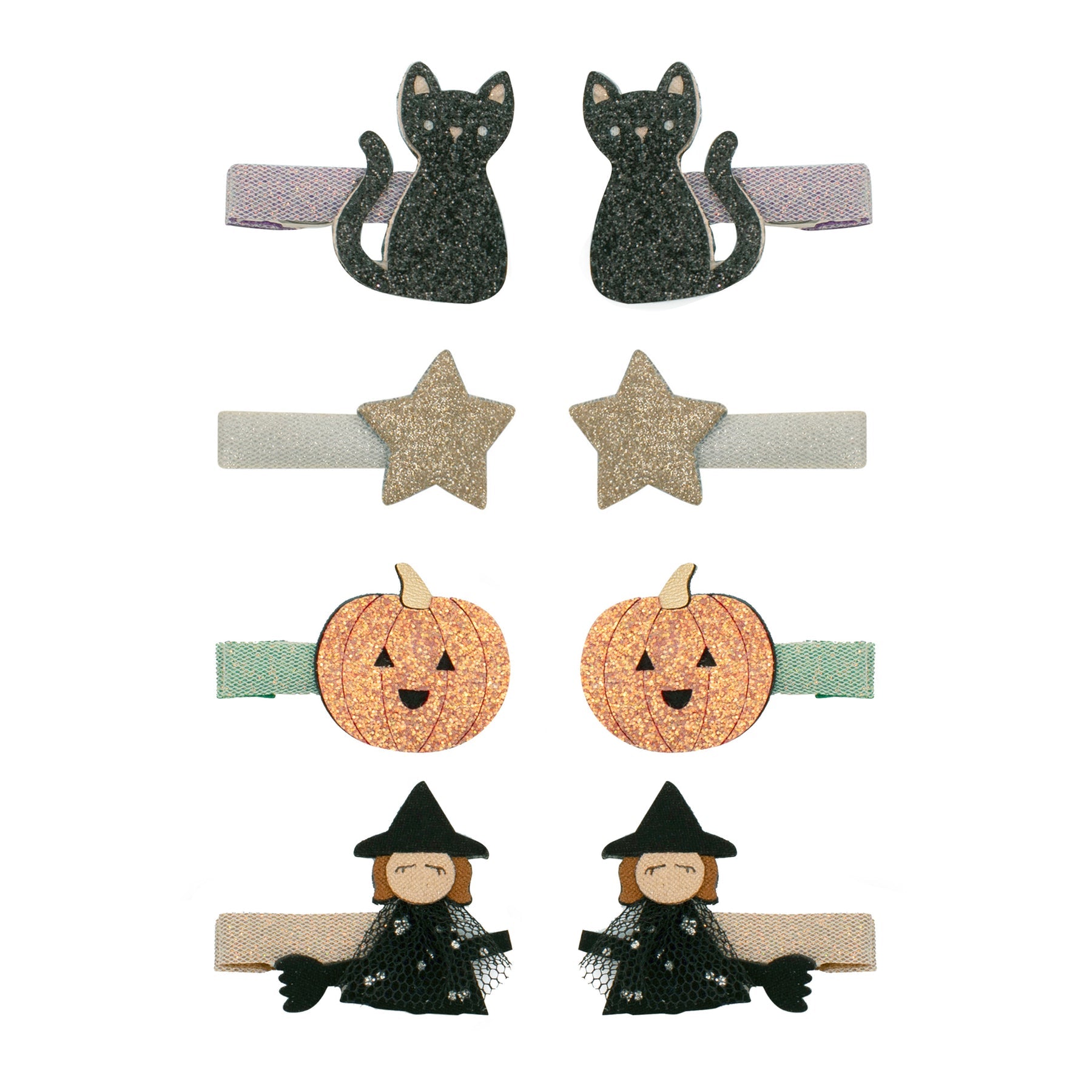 Il set include 8 mini mollette con motivi a tema – cappelli da strega, fantasmini, zucche e stelline – realizzati in morbida similpelle con finiture lucide, glitterate e metallizzate. Grazie al pratico fermaglio rivestito in gros-grain, restano ben salde tra i capelli senza tirare o rovinare le ciocche.