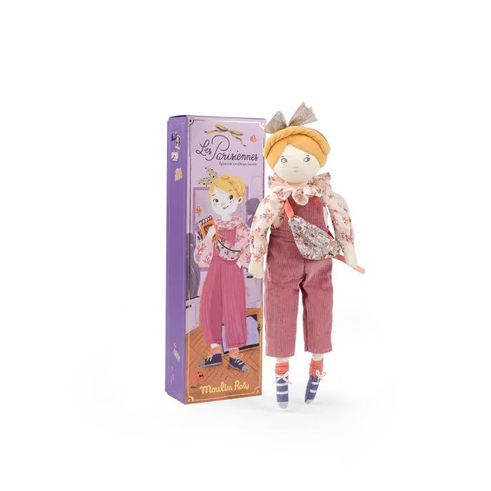 Alta 41 cm, indossa una elegante salopette in velluto abbinata a una banane coordinata e a un grande colletto floreale. Il suo viso dolce, ricamato e serigrafato, esprime tutta la poesia di Moulin Roty. La bambola è presentata in un raffinato cofanetto illustrato da Lucille Michieli, che la rende perfetta come regalo speciale o pezzo da collezione.