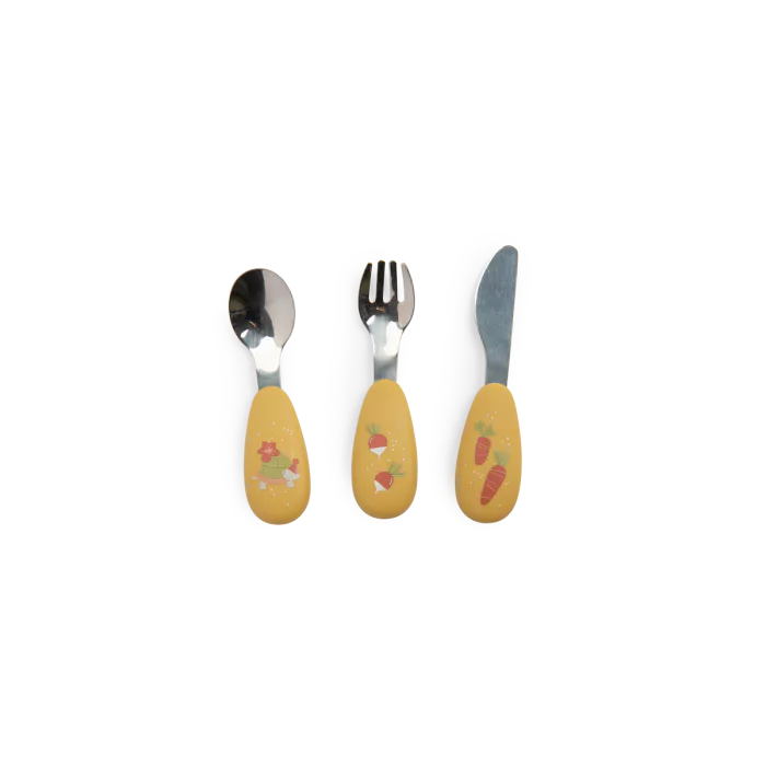 Pensate per aiutare i più piccoli a mangiare in autonomia, queste posate combinano acciaio inox e manici in silicone morbido, studiati per una presa facile e sicura. Le delicate illustrazioni ispirate al mondo dei tre coniglietti rendono ogni pasto un momento dolce e divertente.